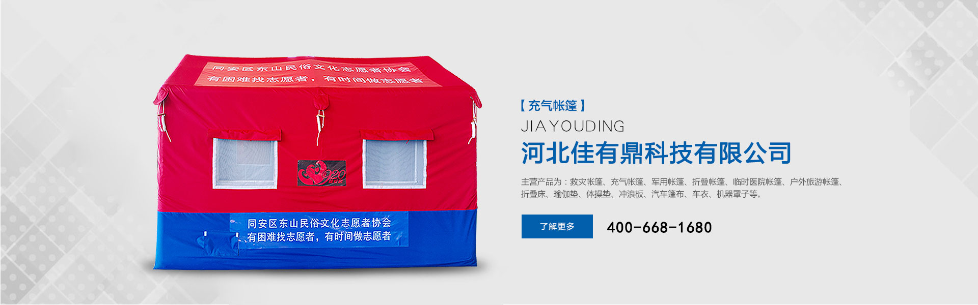 河北佳有鼎科技有限公司原為北京五環(huán)精誠帳篷有限責任公司多年來專注于應急救災防護和戶外用品的研發(fā),是一家集研發(fā)、設計、生產、銷售、服務于一體的綜合型公司。